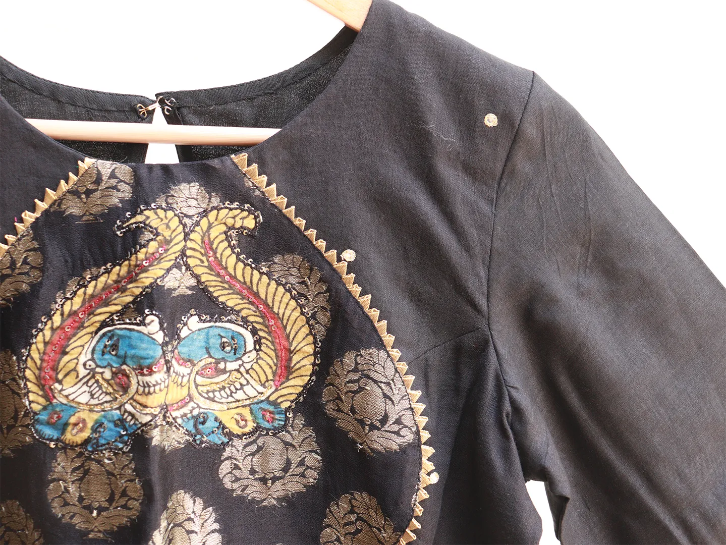 Front Detail - Hand painted Kalamkari, silk thread Hand embroidery,sequin ,mirror work and gota